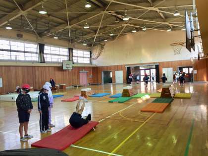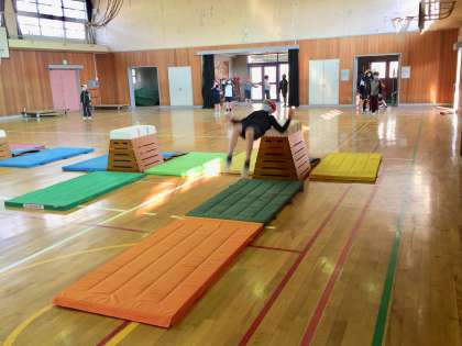 5年生体育の授業では、跳び箱の練習とテストをしていました。勢いをつけて跳ぶ様子には迫力がありました。「すごい」「やった〜」などの声を上げながら、競技する子も、見ている子も感動がありました。