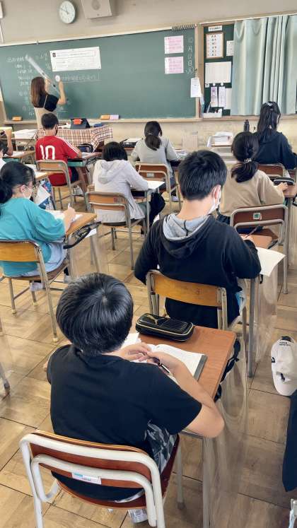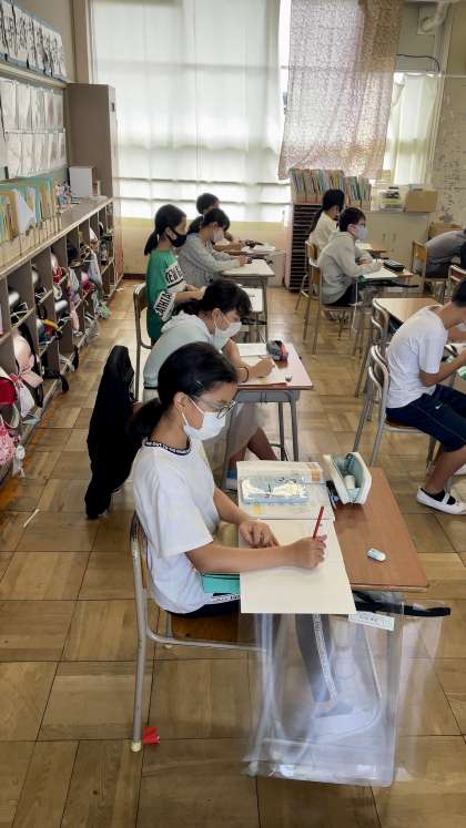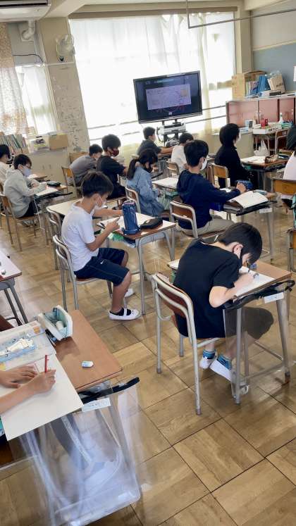 6年生算数の授業は、水槽の水の深さは、水を入れる時間に比例するという比例の関係を式に表す学習でした。