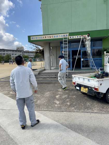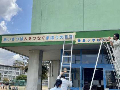 校門を入るとすぐに見える玄関上の「あいさつは 人をつなぐ まほうの言葉」の標語看板が一部傷んできたので、枚方市の担当の皆さんに作り替えていただきました。ありがとうございました。新しいものは、以前のものと少し違うところがあります。違いが分かるでしょうか?