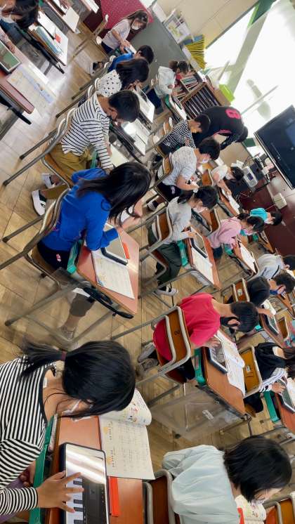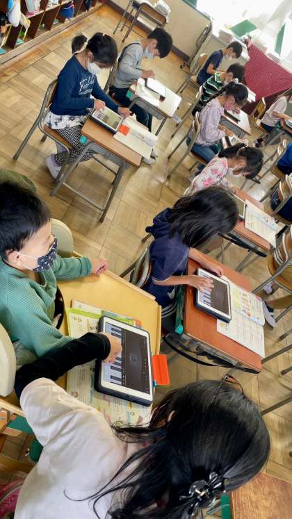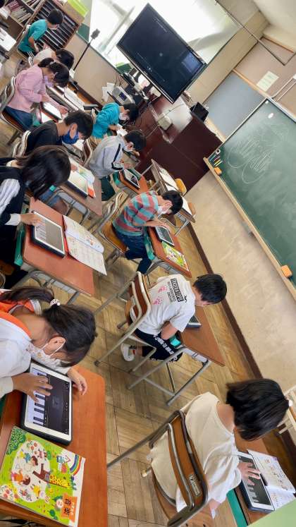 2年生音楽の授業は、「山のポルカ」の演奏でした。iPadのアプリを使い、上手に演奏していました。