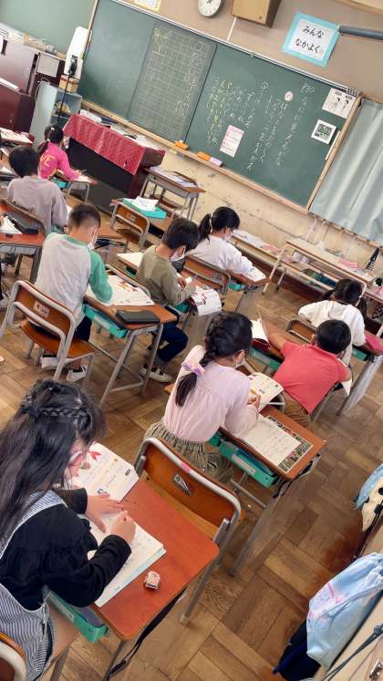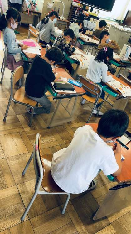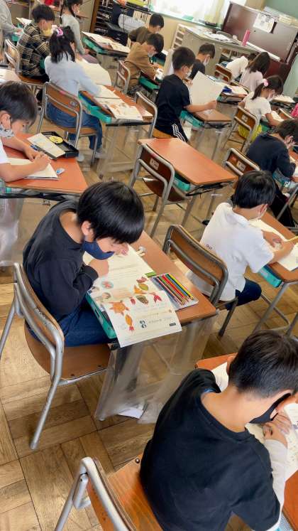 1年生こくごの時間は、教科書の絵を参考に、絵を描き、それが何に見えるかを文で表していました。