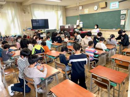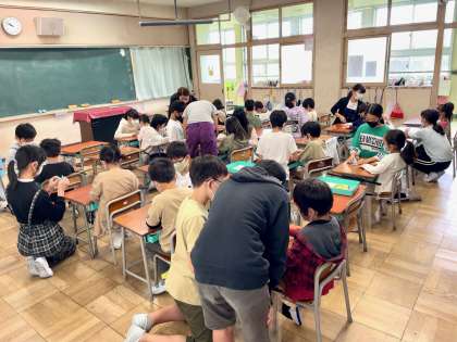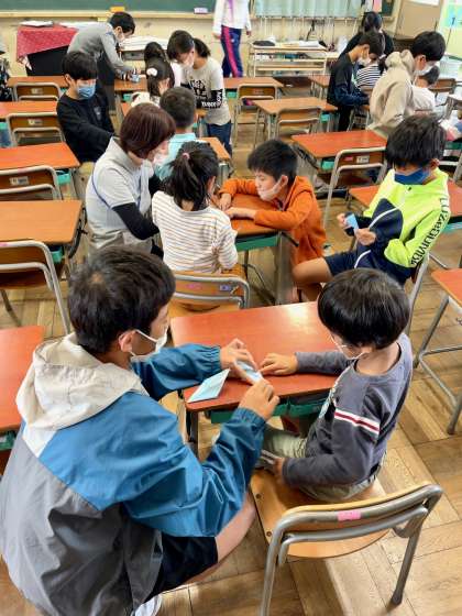 6年生が広島への修学旅行へ千羽鶴を持っていきます。本日、6年生が1年生に鶴の折り方を教えてあげていました。親切に教えてあげ、1年生もうれしそうでした。