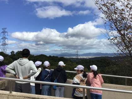 まず1組は、急な山道を登り、ステラホールへ。屋上から枚方市の街を眺めました。