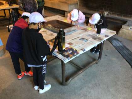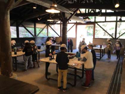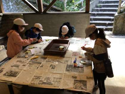 その頃、1組は、下の炊飯場まで下りて、オカリナ作りに取り組みました。夢中でイラストを書き込んでいました。