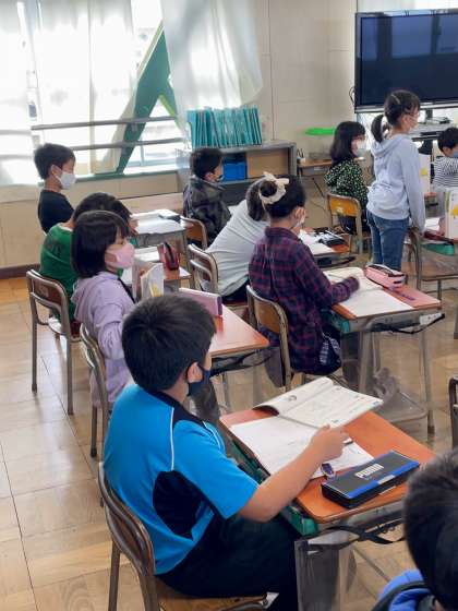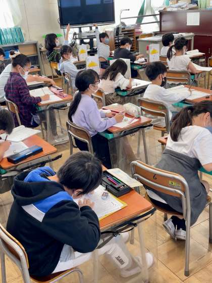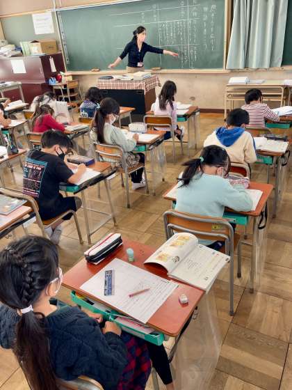 3年生国語の授業では、絵を見て、「登場人物」「話したり、考えていること」「出来事」を想像し、発表していました。最終的には、想像して、物語を書くようです。