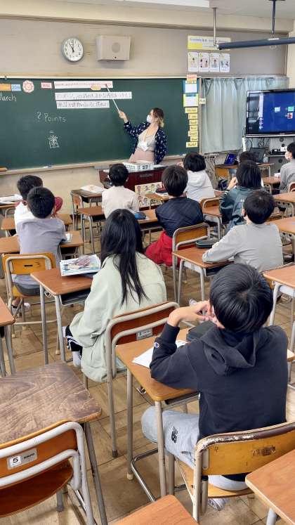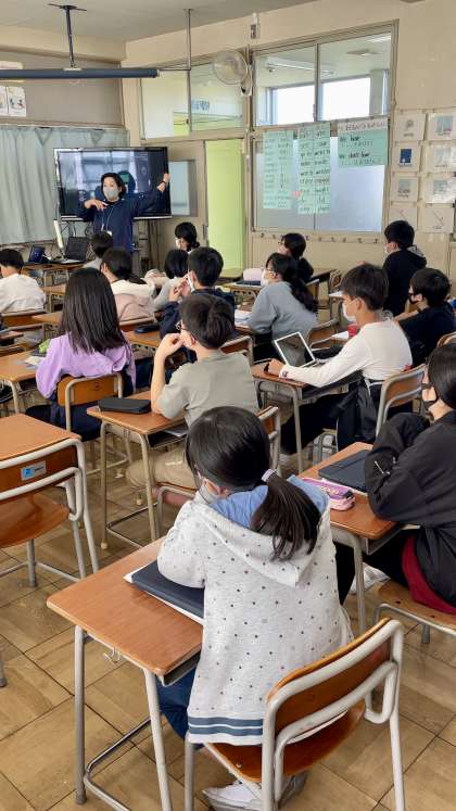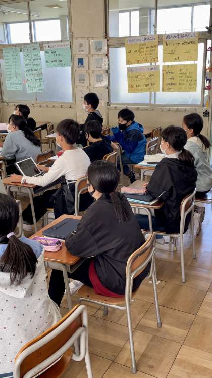 6年生英語の授業では、アニメーションの話の大まかな内容をつかんだり、施設や建物の言い方に慣れることがが学習目標でした。NETの先生の英語オンリーの話や指示を理解し、活動していました。