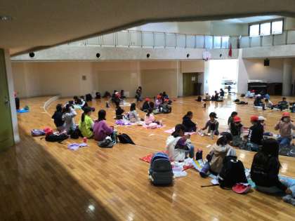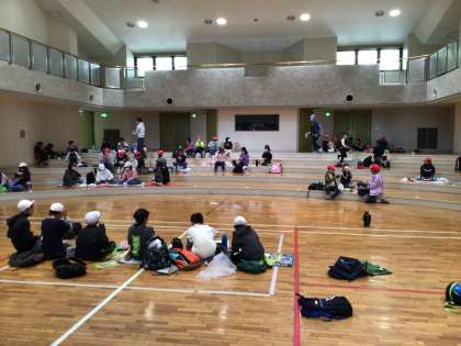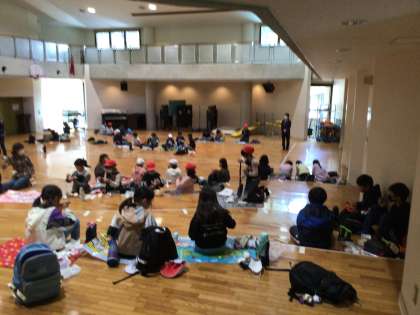 いよいよお昼御ご飯です。天気は良かったのですが、じっとしていると思いのほか寒かったので、ホールをお借りして、お弁当をいただきました。