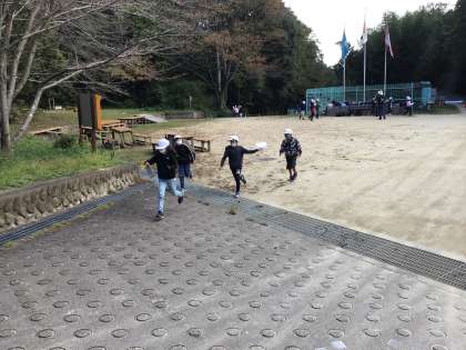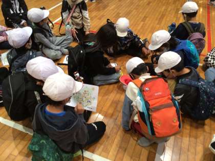 午後は最後のプログラム。1組はオリエンテーリングです。ホールで説明を聞き、グループごとに地図を確かめ、元気よくスタートです。