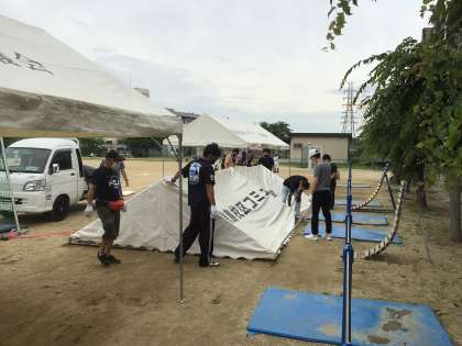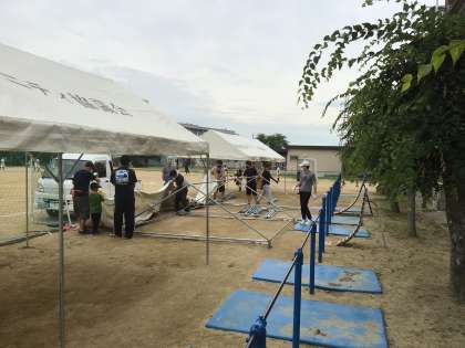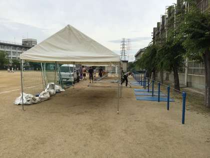 今年も磯島校区コミュニティの皆様に、熱中症対策としてテントを設営していただきました。蒸し暑さのある中、早朝より作業していただき、まことにありがとうございました。