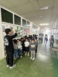 午後に校内一斉放送で「地震が発生したことを想定したお知らせ」を伝え、その場で各自が自分の身を守る行動をとりました。丈夫な机の下に身を隠したり、建物から離れた場所で手で頭を守ったり、みんなそれぞれの場所や条件によく対応していました。