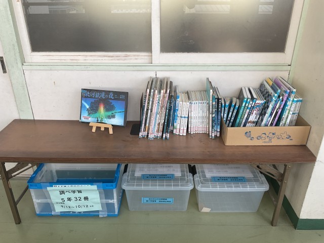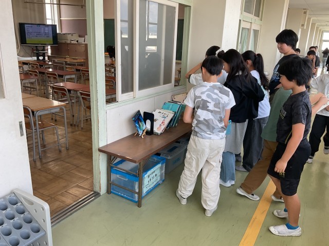 廊下には、市立図書館からかりている宮沢賢治の作品が並べらています。朝の会や休み時間には、作品を手に取り、読書に取り組む姿が見られます。中でも教科書にある『注文の多い料理店』は、ユーモラスで不思議な世界観の中に、宮沢賢治ならではの表現の工夫がちりばめられています。