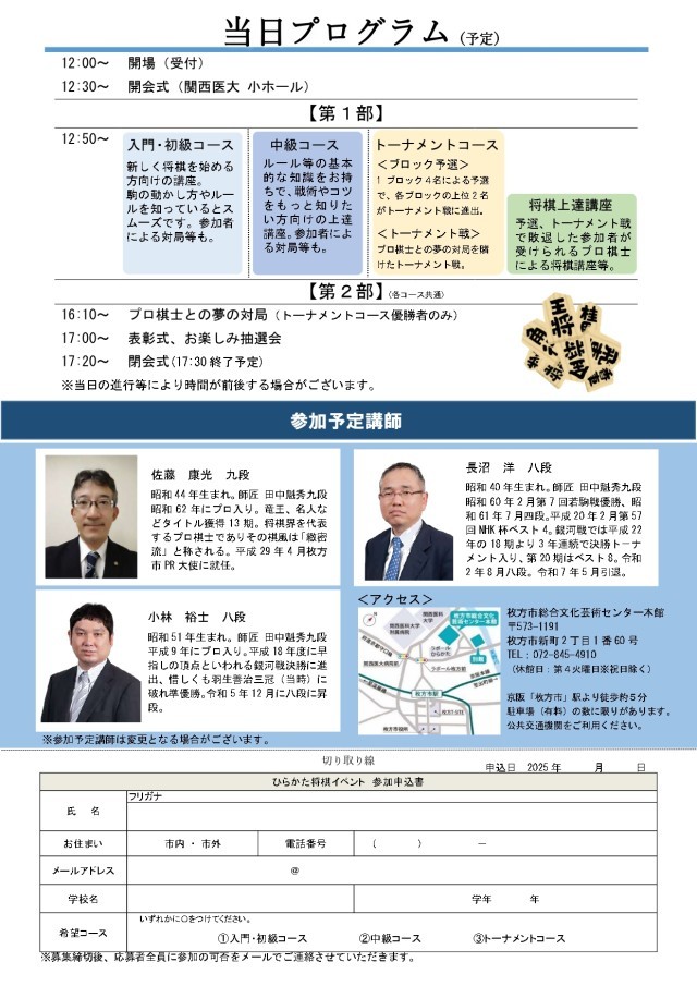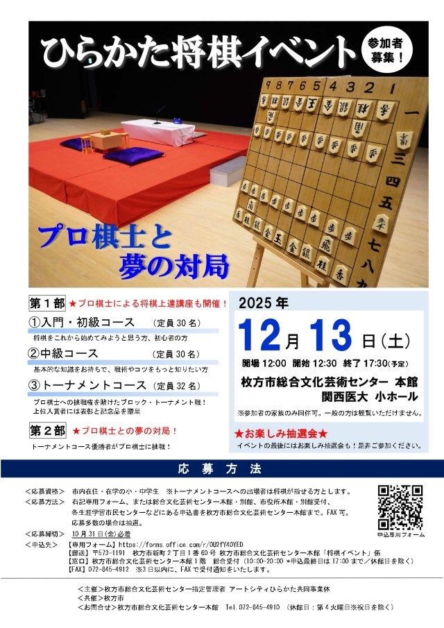 枚方にゆかりのあるプロ棋士を迎え、子どもたちがプロから直接指導を受け、日本の伝統文化である将棋に触れる機会を提供することを目的に「ひらかた将棋イベント」を12月13日(土)に枚方市総合文化芸術センター本館で開催されます。