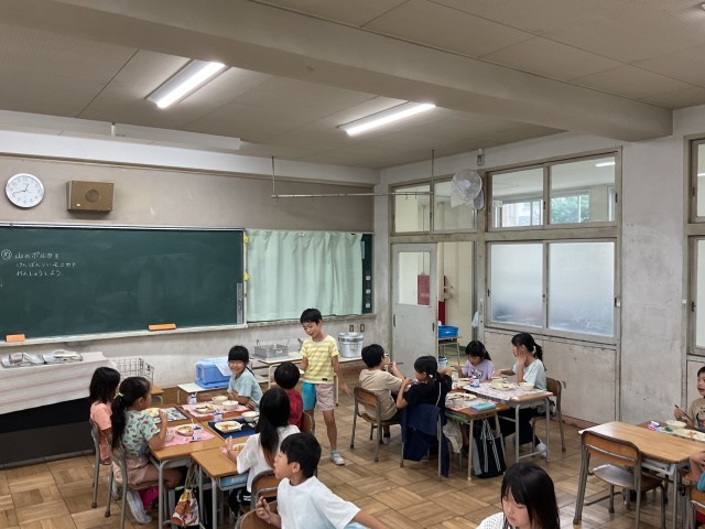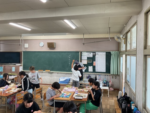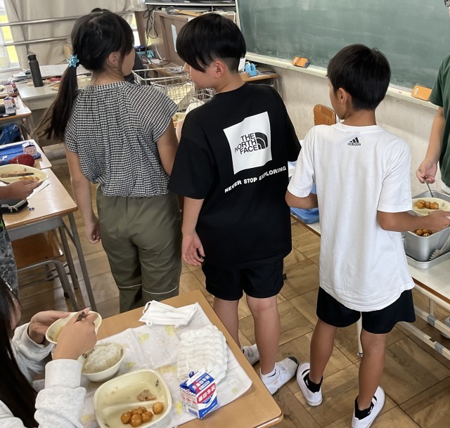 今日の給食は、月見団子、さけのねぎだれ、月見汁、ご飯、牛乳です。年に一度のみたらし団子です。
