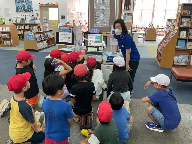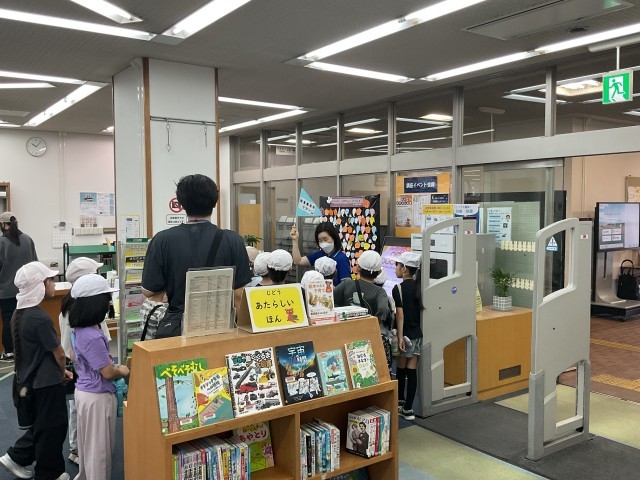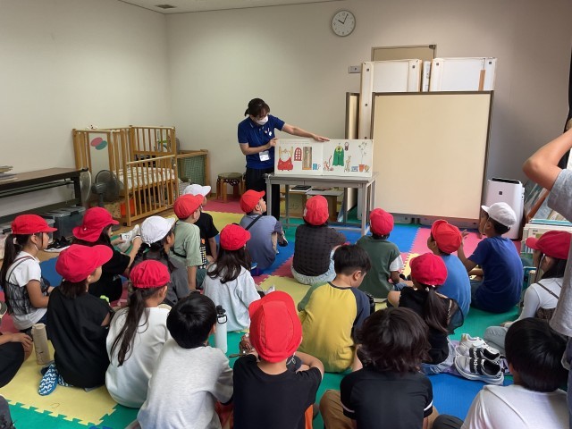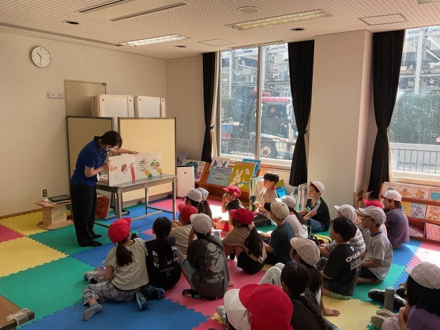 当日は2つのグループに分かれて、図書館の施設見学や大型絵本の読み聞かせを体験しました。読み聞かせだけでなく、図書館に関するクイズもあり、子どもたちは楽しみながら図書館の役割や仕組みについて学ぶことができました。