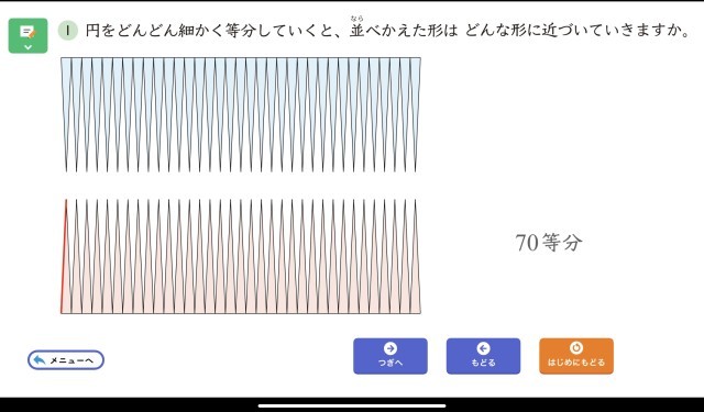 授業では、デジタルコンテンツも活用しました。円の面積の求め方をシミュレーションできる教材を使い、画面上で円を分割して並べかえる様子を確認。紙では難しい細かい分割も、デジタルなら簡単に体験できます。デジタルコンテンツでさらに理解を深めています。