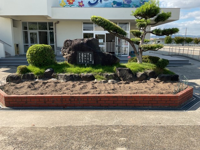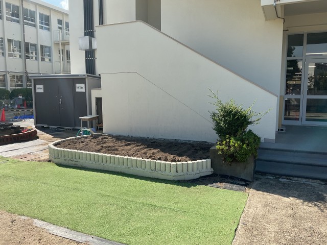 正門前の花壇では、夏の花が咲き終わり、現在は花は見られませんが、花壇自体はきれいに整えられています。来年度に向けて新しい花を植える準備として、土の入れ替え作業も進められています。