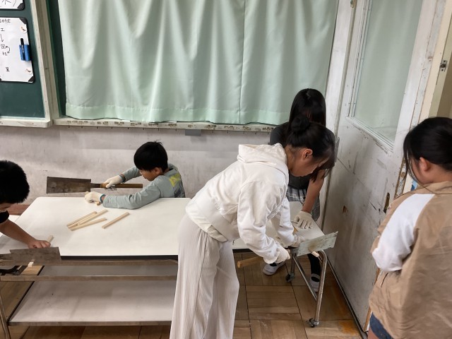 そして、今日は、細木を長さ通りに切る作業に取り掛かっているところまで進んでいる子どももいました。最終は、細木・台板に釘を打って完成させます。