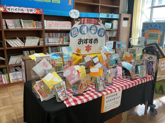 現在、図書館では図書委員の児童が選んだ「おすすめの本」を掲示しています。どの本も人気があり、たくさんの児童が借りています。中には、四字熟語をドラえもんの漫画でわかりやすく解説している本もあり、楽しく学べる内容になっています。