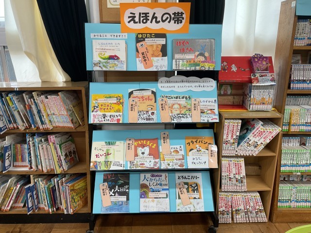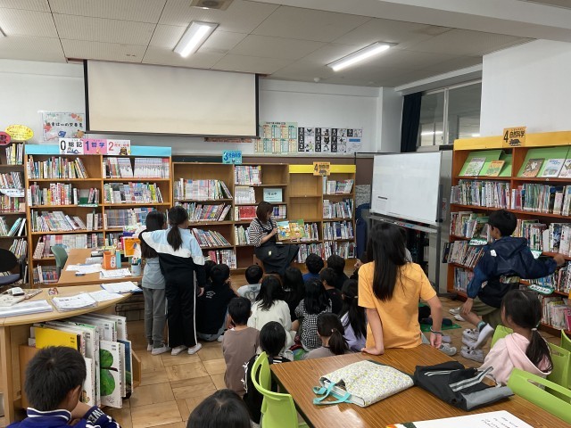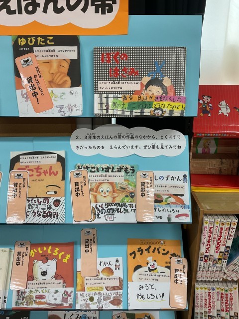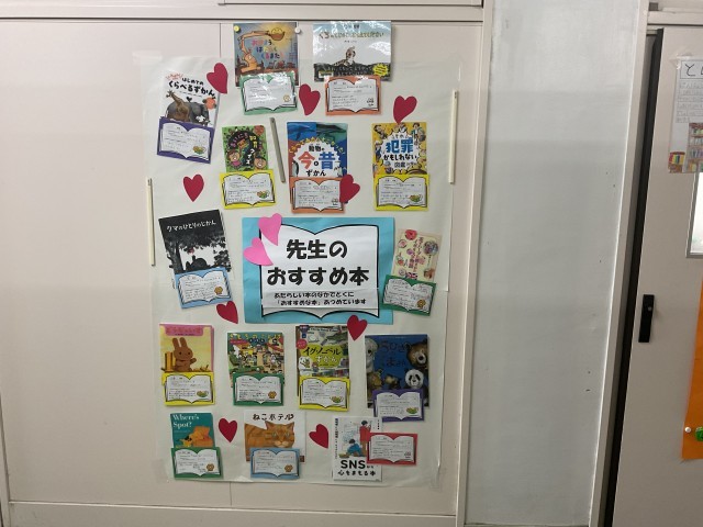 また、廊下には、先月ブログにも掲載した先生方のおすすめの本も紹介されています。さらに、2・3年生が作成した本の帯(本の紹介文)のコピーを実際の本に貼って展示しています。これらの本も多く貸し出されており、図書館は子どもたちの「読みたい!」でいっぱいです。ちょうど図書館では、学校司書さんの読み聞かせを3年生が聞いていました。