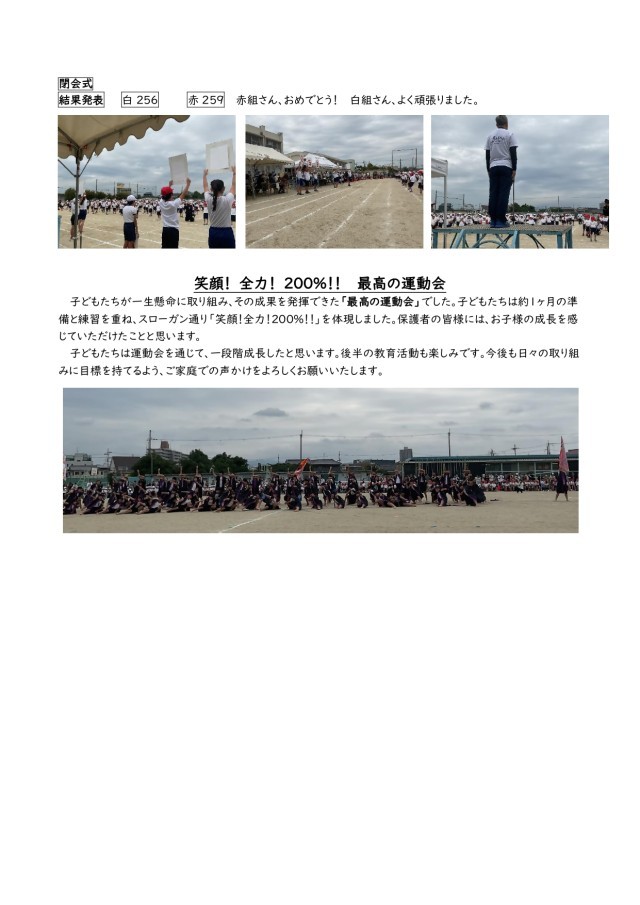 皆さんの頑張りで、「笑顔 ! 全力! 200% !! 最高の運動会」になりました。最後まで心を合わせてやりきった皆さん全員に、心から拍手を贈りたいと思います。よく頑張りました。