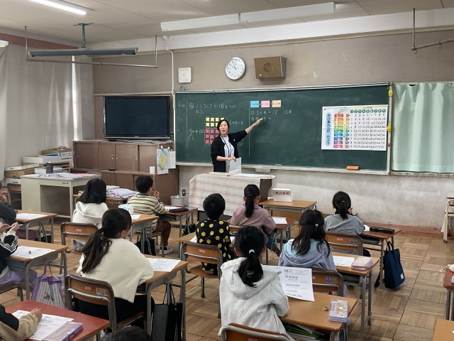 まずはペアになって、3の段を声に出して唱え合いました。「3、6、9、12…」とリズムよく唱える中で、「数の並びにきまりがある!」「1の位が順番に変わっている!」など、子どもたちからさまざまな気づきが生まれたと思います。その後は、クラス全体で一緒に3の段を唱えていました。繰り返し声に出すことで、数の感覚やパターンを自然に身につけていけると思います。