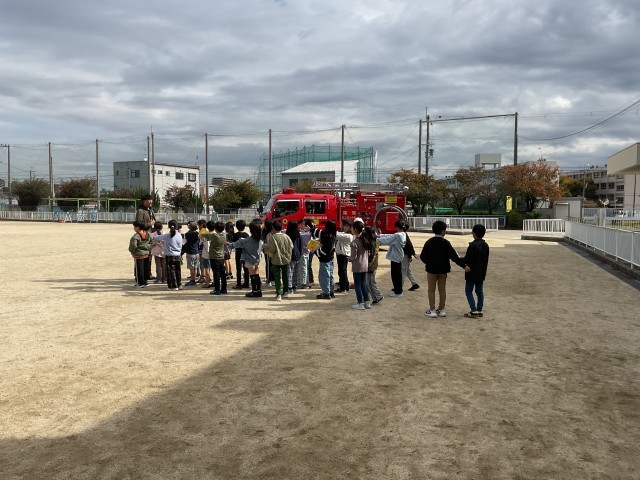 消防車が到着、子ども達が整列し、今からという時に