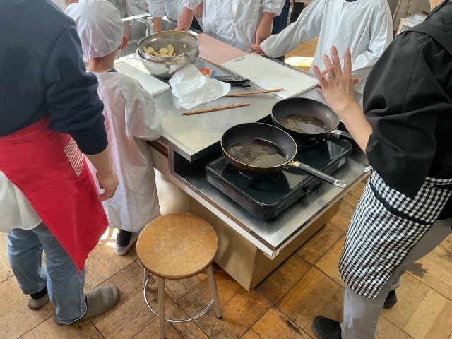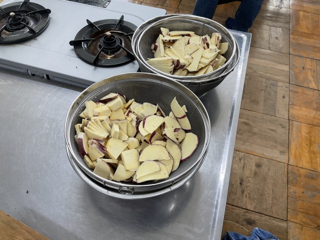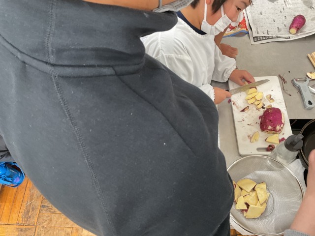 そのサツマイモを使って参観で保護者の方の協力のもと調理実習をしました。