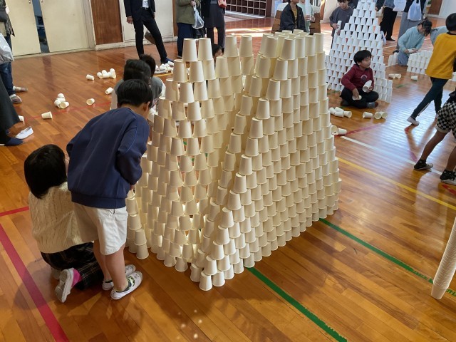 体育館では3年生が1万個の紙コップを使い様々な形を作っていました。