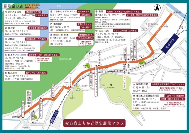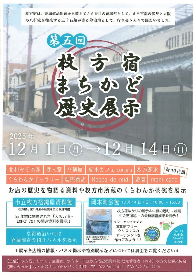市内文化財の普及啓発と文化財保護意識を醸成するとともに、人の流れを創出し地域の活性化を図ることを目的に、枚方宿の店舗等で文化財の展示を行う「まちかど歴史展示」を令和3年度から開催しています。