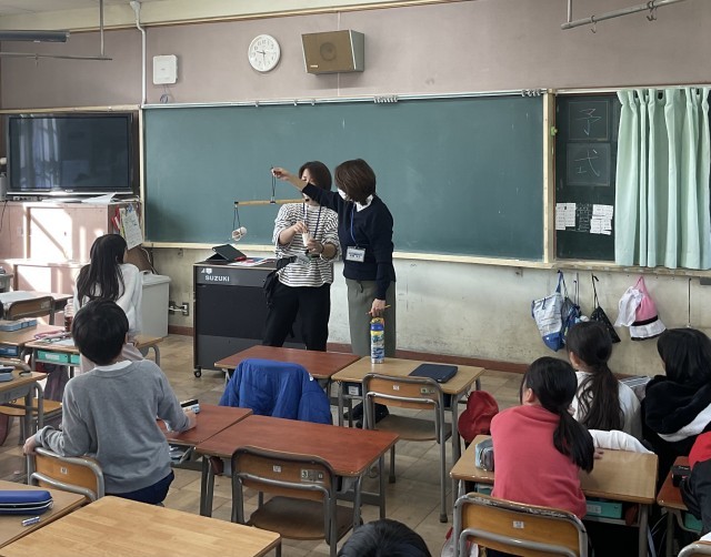 隣のクラスでは「重さの単位と測り方」の導入が行われていました。先生が実際に道具を使い、いろいろなものの重さを比べる活動です。これから子どもたちは gやkg といった単位、そして「はかり」の使い方を体験的に学んでいきます。
