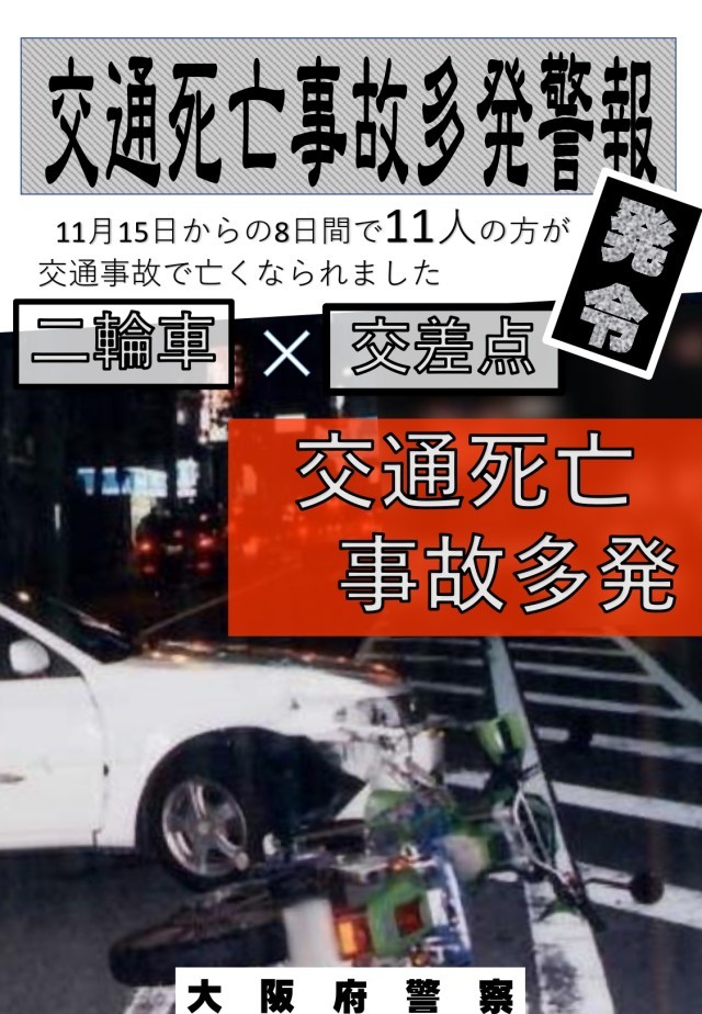 府下における交通事故死者数は11月26日現在において111名と前年と比較して5名増加しています。今一度、交通ルール遵守の重要性を図っていただきますよう御協力よろしくお願いいたします。