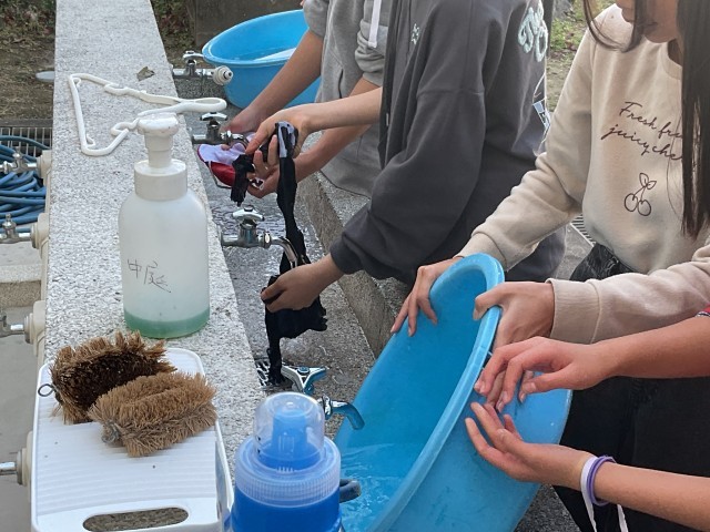 手洗いによる洗濯をしていました。「衣服の手入れで快適に」の単元を学習しています。衣服を清潔に保つための工夫や、昔ながらの洗い方の体験です。