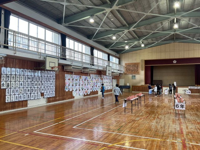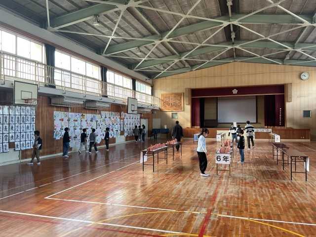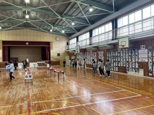 体育館には各学年の子どもたちの作品が並び、さだ西美術展が開催されていることはお知らせしましたが、子どもたちも時間を取ってじっくりと鑑賞しています。
