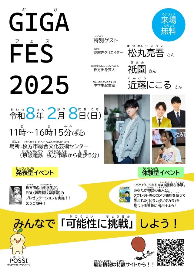 枚方市教育委員会からのお知らせです。今年もGIGAフェス2025を開催することが決定しました!「可能性に挑戦」をテーマに、GIGAフェス2025を開催します。