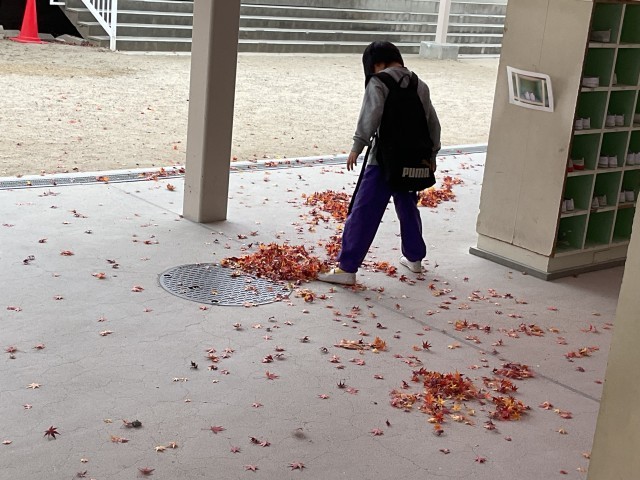 道を歩いていると、足元にはたくさんの落ち葉。学校の校庭や通学路にも、イチョウやカエデの葉がじゅうたんのように広がっています。特に真っ赤に色づいたカエデは、子どもたちの目を引き、何人かの子が「先生にプレゼント!」と手渡してくれました。