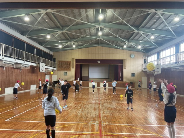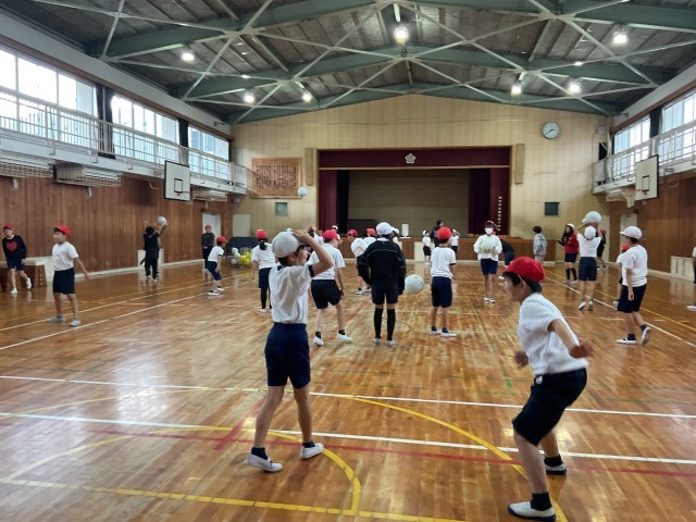 ソフトバレーボールの学習を行っていました。 子どもたちは強く打ちたい気持ちもありますが、「次の人が打ちやすい高さや方向」を意識してトスを練習です。