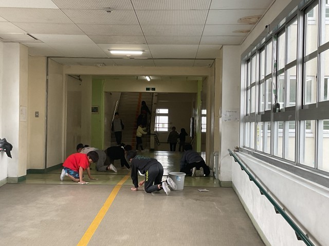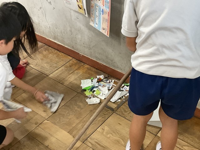 子どもたちが階段や廊下を一生懸命に掃除してくれていました。みんなが通る場所がきれいになると、気持ちもすっきりしますね。掃除の後に雑巾が落ちていたら、きちんと直して片づける姿も見られました。
