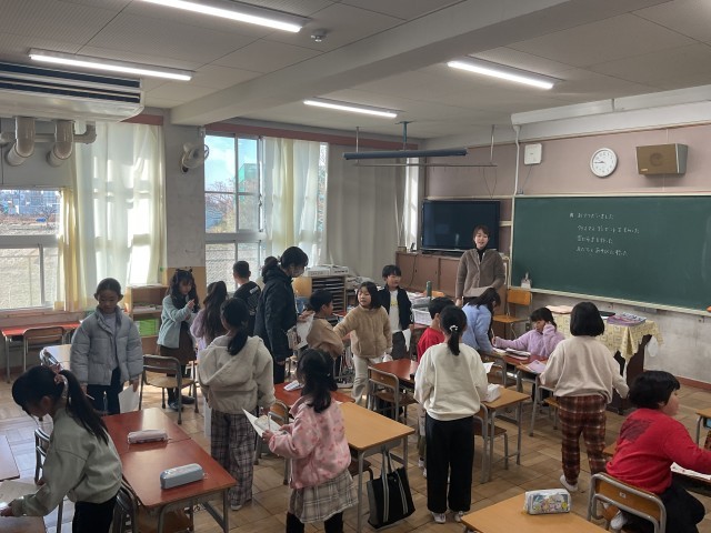 教室をのぞくと、冬休みの思い出を楽しそうに話す姿や、「冬休みビンゴ」「冬休みすごろく」に取り組むクラス、正月にまつわる話で盛り上がるクラスなど、どの学級にも明るい笑顔があふれていました。