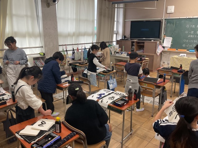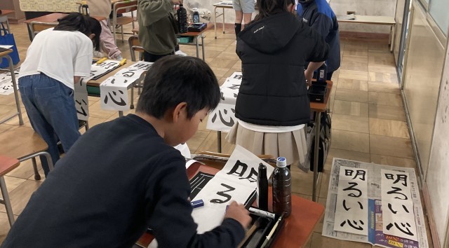 4年生も書き初めに取り組みました。課題は「明るい心」です。長い半紙に大きくのびのびと書くため、子どもたちは机の上に半紙を丁寧に広げ、姿勢を整えてから筆を運んでいました。