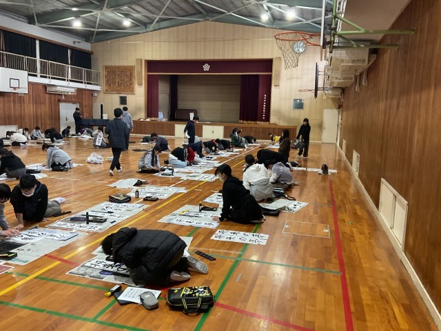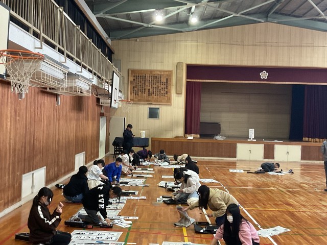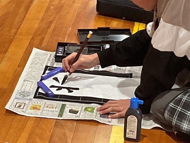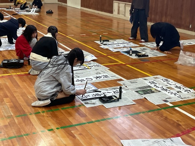 6年生も5年生に引き続き、体育館で書き初めを行っていました。「進む勇気」「将来の夢」のどちらかを選んで書きました。広い空間でのびのびと筆を運びながら、これまで学んできた筆づかいを生かして一画一画に集中して取り組む姿が見られました。