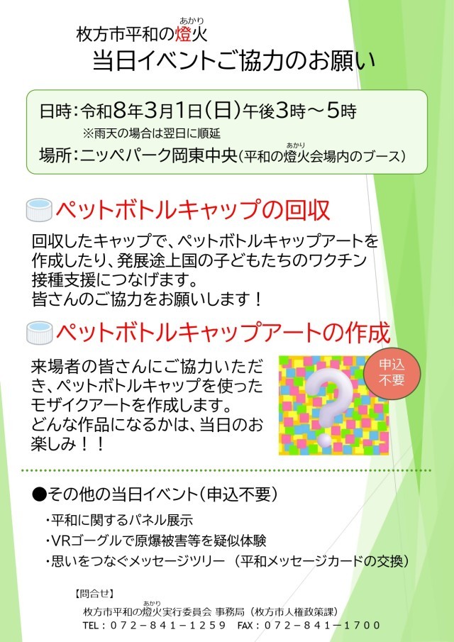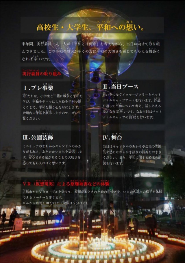 ※当日、午後3時~5時まで、会場でペットボトルキャップの回収(リサイクル収益をワクチン費用へ寄付)やペットボトルキャップアートの作成、VRゴーグルで原爆被害等を疑似体験できるブースの出展などを行います。