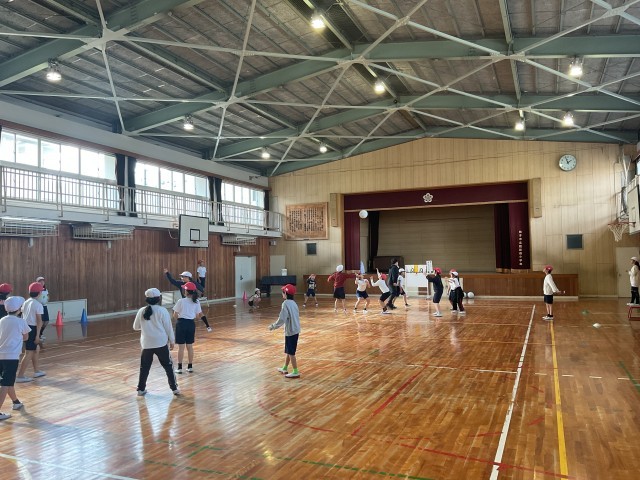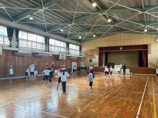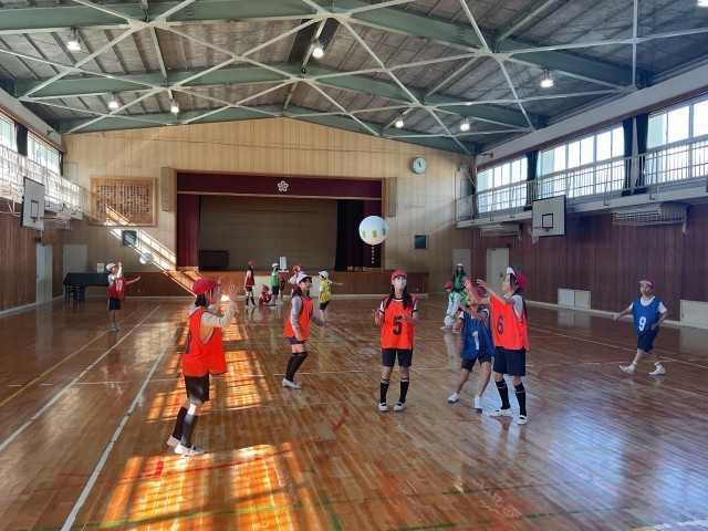 「ポートボール」に取り組んでいます。ポートボールは、仲間とパスをつなぎながら得点をめざす運動で、協力して動くことや、正確にボールを扱うことが大切です。