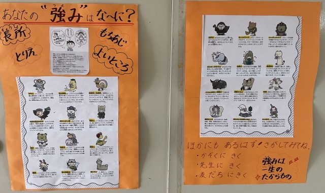学校では「あなたの強み」の掲示物があります。チームワーク・感謝する心・ユーモア・学ぶ意欲・誠実さ・忍耐力など、たくさんの“強み”の言葉が並んでいます。