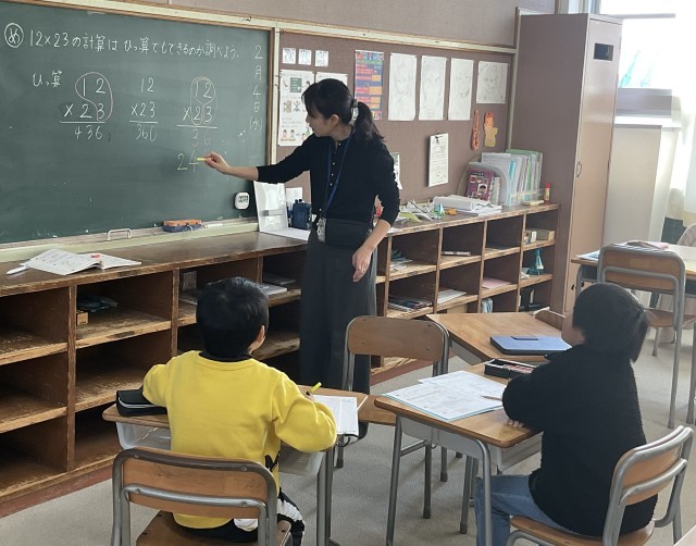 12×23の計算を通して、20と3に分けて考える方法や、筆算で十の位を一つ左にずらして書くことを確認しました。黒板での筆算では、「どこに書けばいいの?」と気づく場面もあり、理解につながる良い学びになりました。