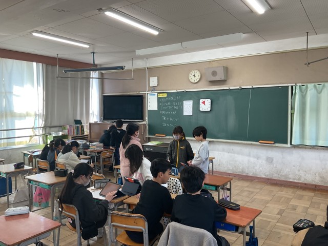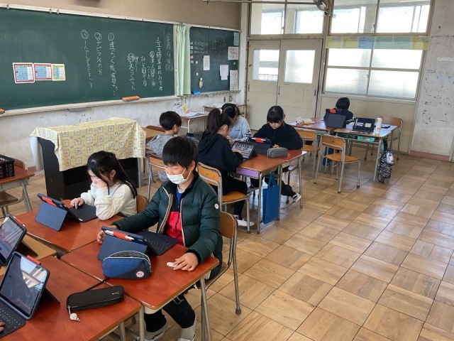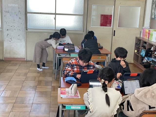 子どもたちは、名所・食べ物・産業などを話し合い、写真の使い方やクイズなども入れ、話す工夫を考えながら、発表準備を進めていました。