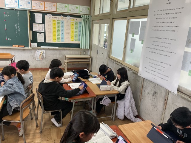 昔から今までの「道具の移り変わり」について調べています。選んだ道具がどのように変わってきたのかを、話の組み立てや話し方を工夫する力を育てる学習を行っていました。