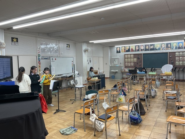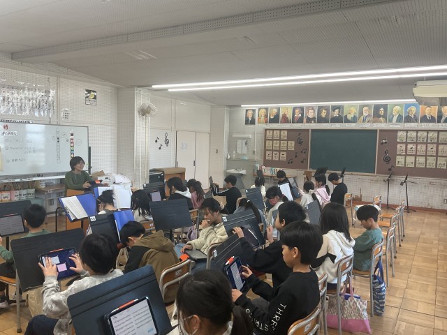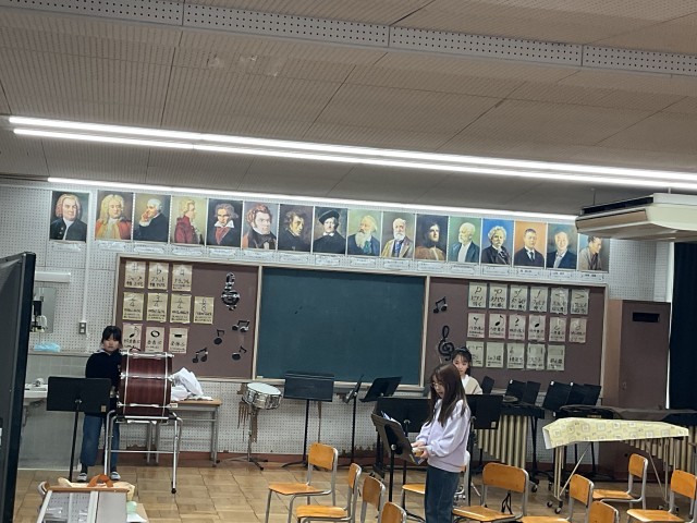 6年生を送る会に向けた合奏練習を進めています。「曲の流れや担当パートの演奏の仕方を知り、練習の見通しをもとう」というめあてのもと、木琴・鉄琴・リコーダー・ピアニカ・ピアノ・大太鼓・ハイハット・シンバルなど、さまざまな楽器で音を合わせていました。