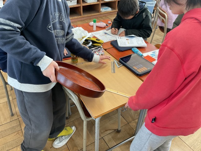 おぼん(校長室のです(^^)/)、なべ、空き缶、ガムテープ、ふるい、茶筒など、身のまわりの円いものを手に取り、どのように測るとよいかを確かめながら活動していました。