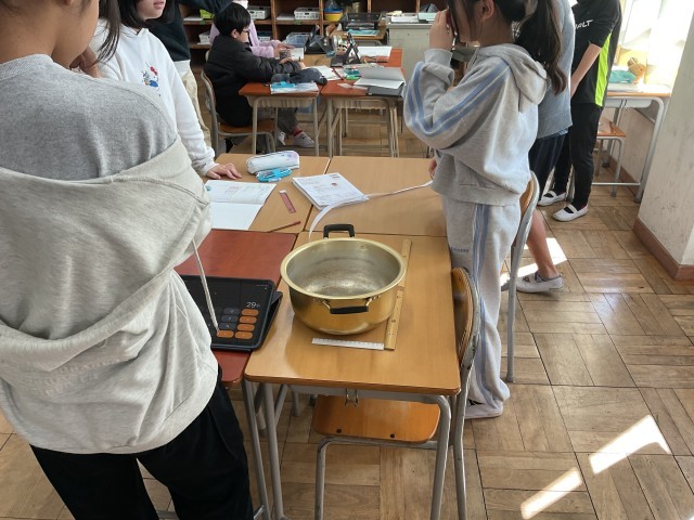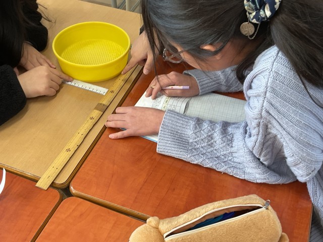 円周の長さが直径の何倍になるのかを、実際のものを使って調べていました。