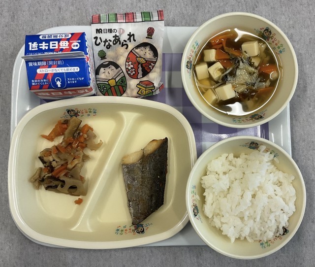 また、この日は「ひなあられ」も提供されました。「給食でお菓子が出る!」と言って大喜びの子どもたちも多く、おかわりはちょっとした争奪戦になるほどの人気でした。季節の味を楽しみながら、行事の意味にも自然と関心が向く、よい時間となりました。